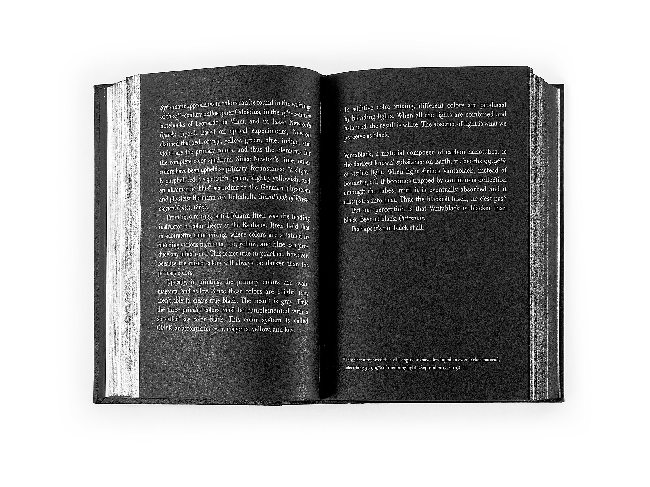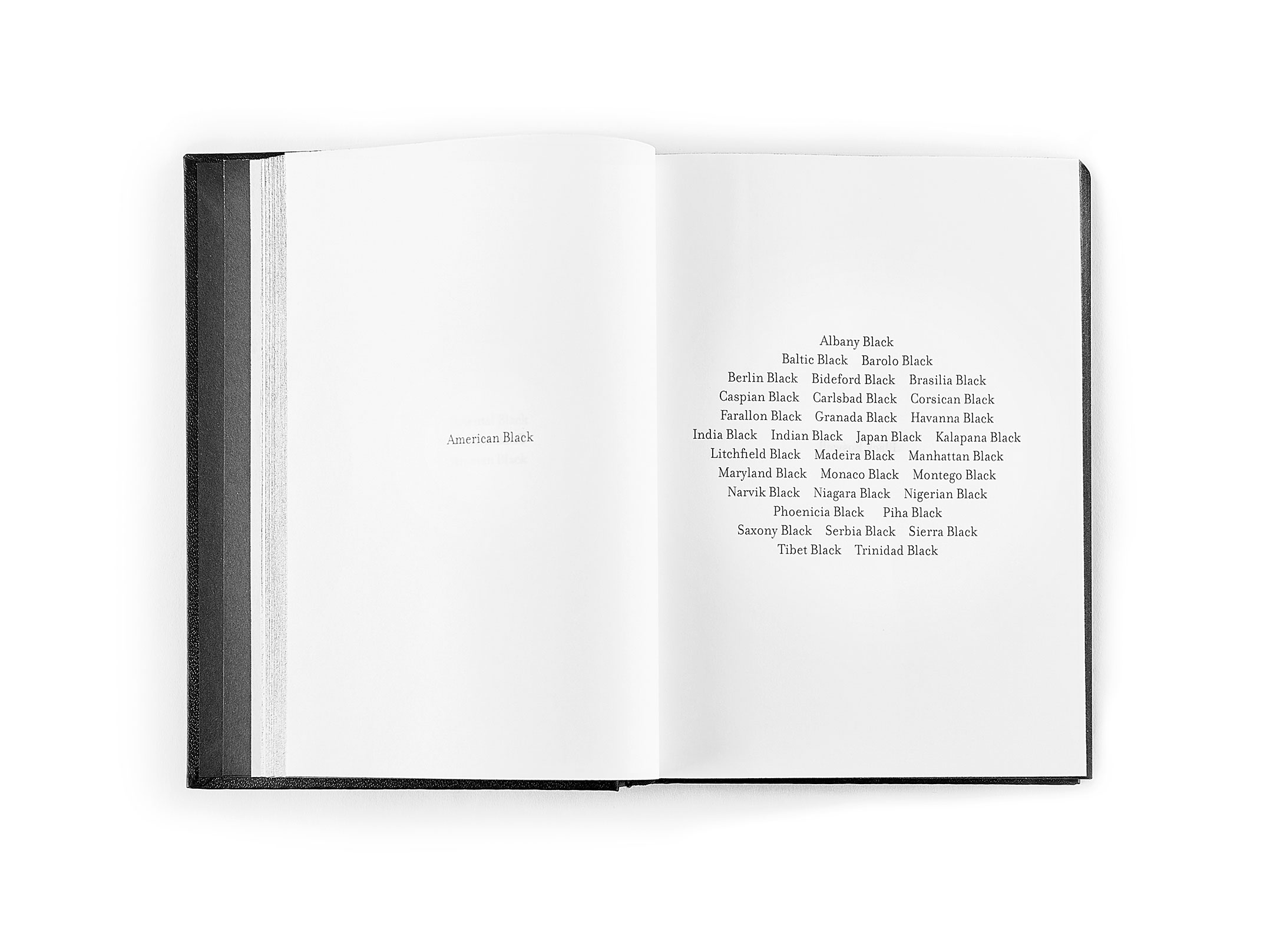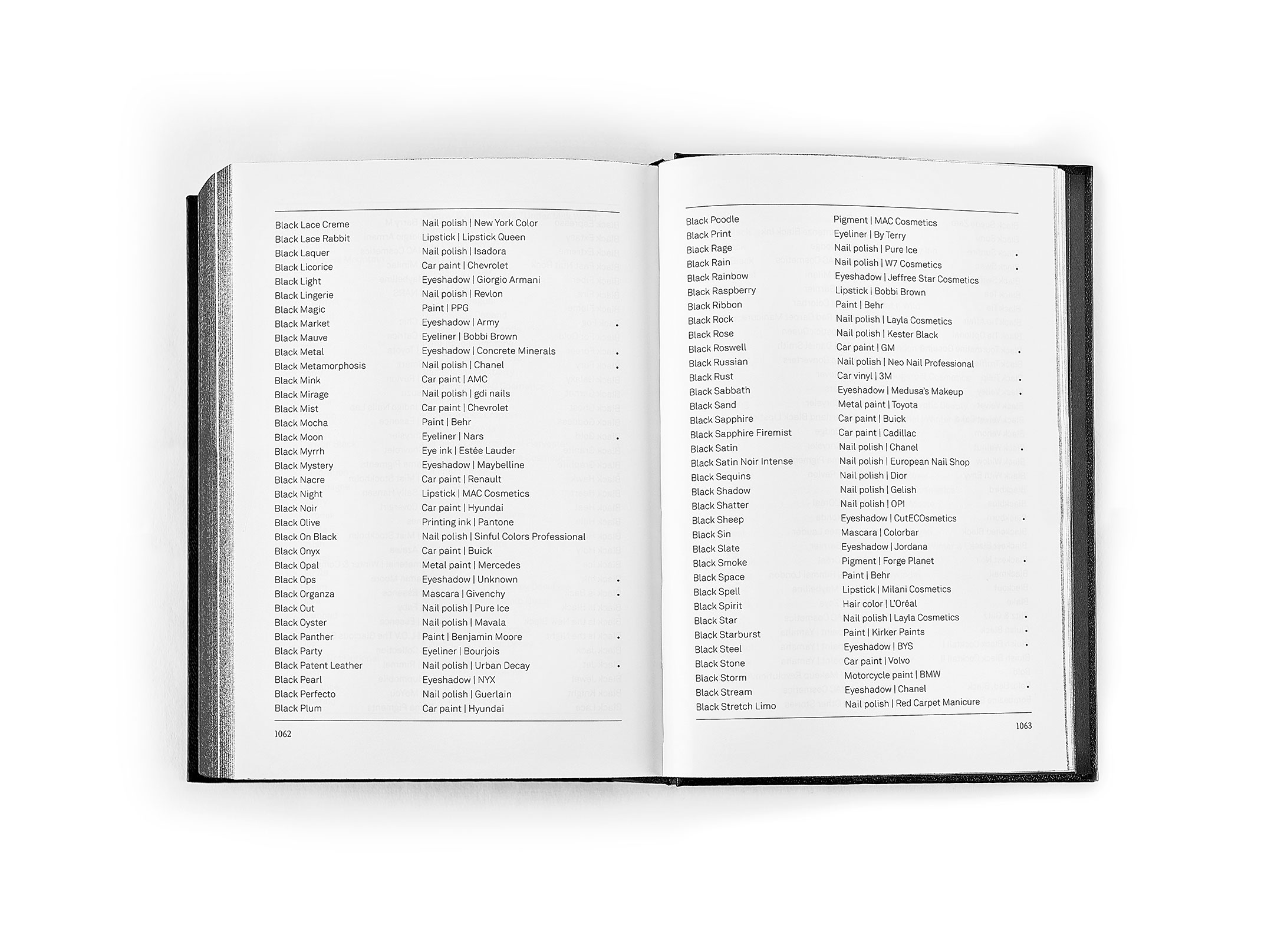 The first comprises 1,001 names for different nuances of black, taken from, for example, make-up, car paint, artist pigments, tattoo ink, and house paint. The often expressive names have been collated into an associative flow that transports the reader from countries and cities, over mountains and oceans, down among plants and animals, out into space, to myths and religions, power and eroticism, war and death.