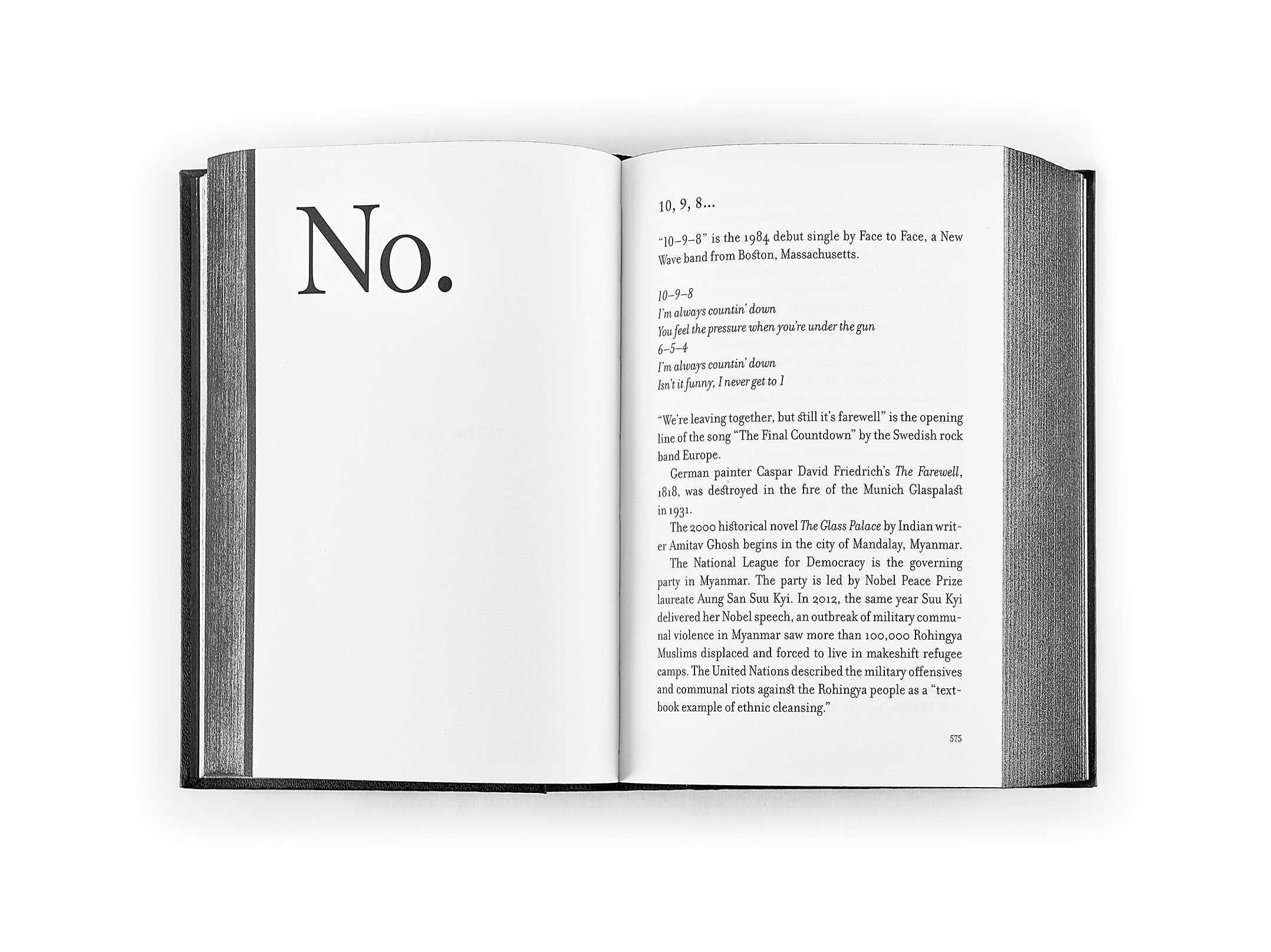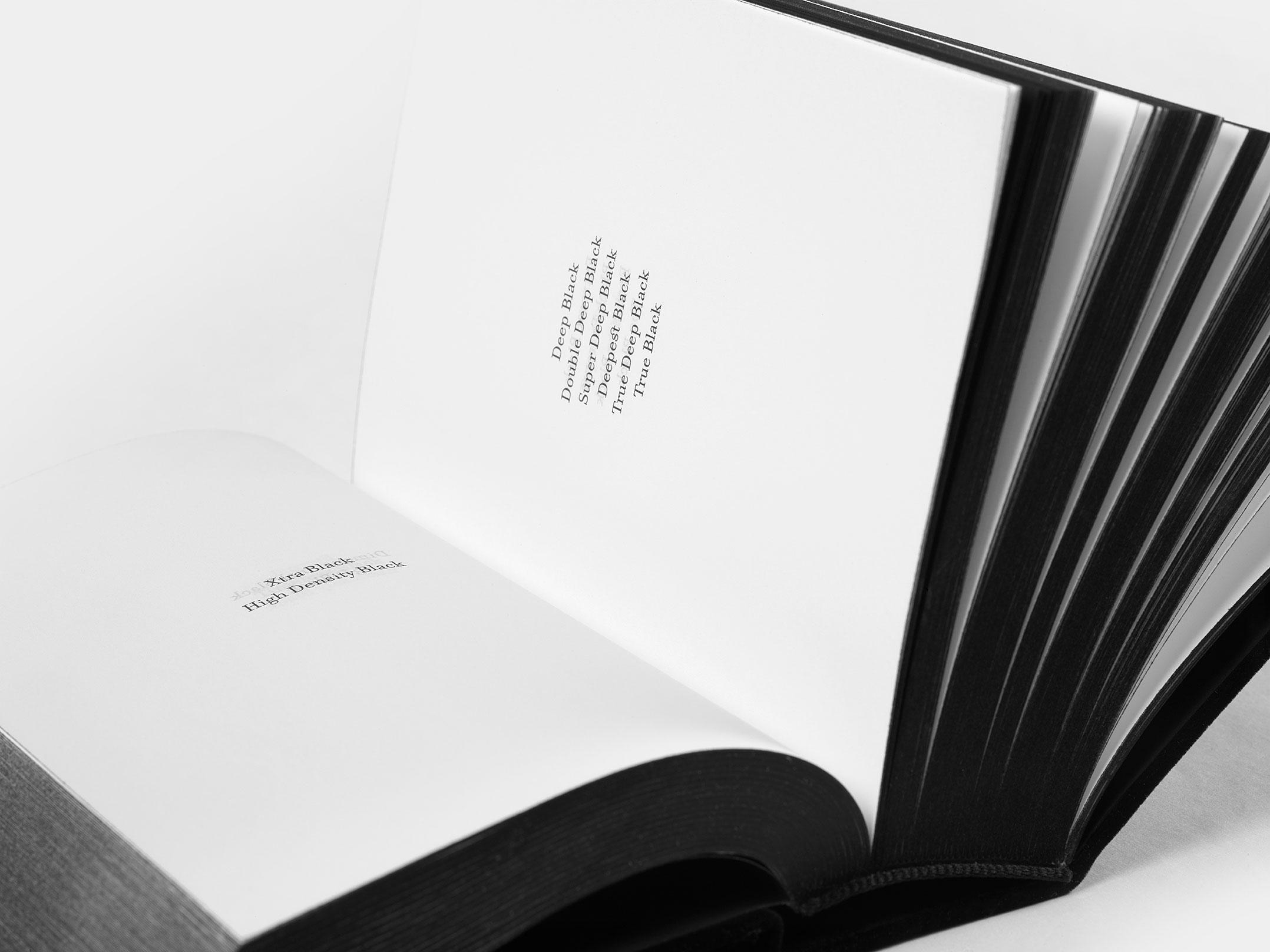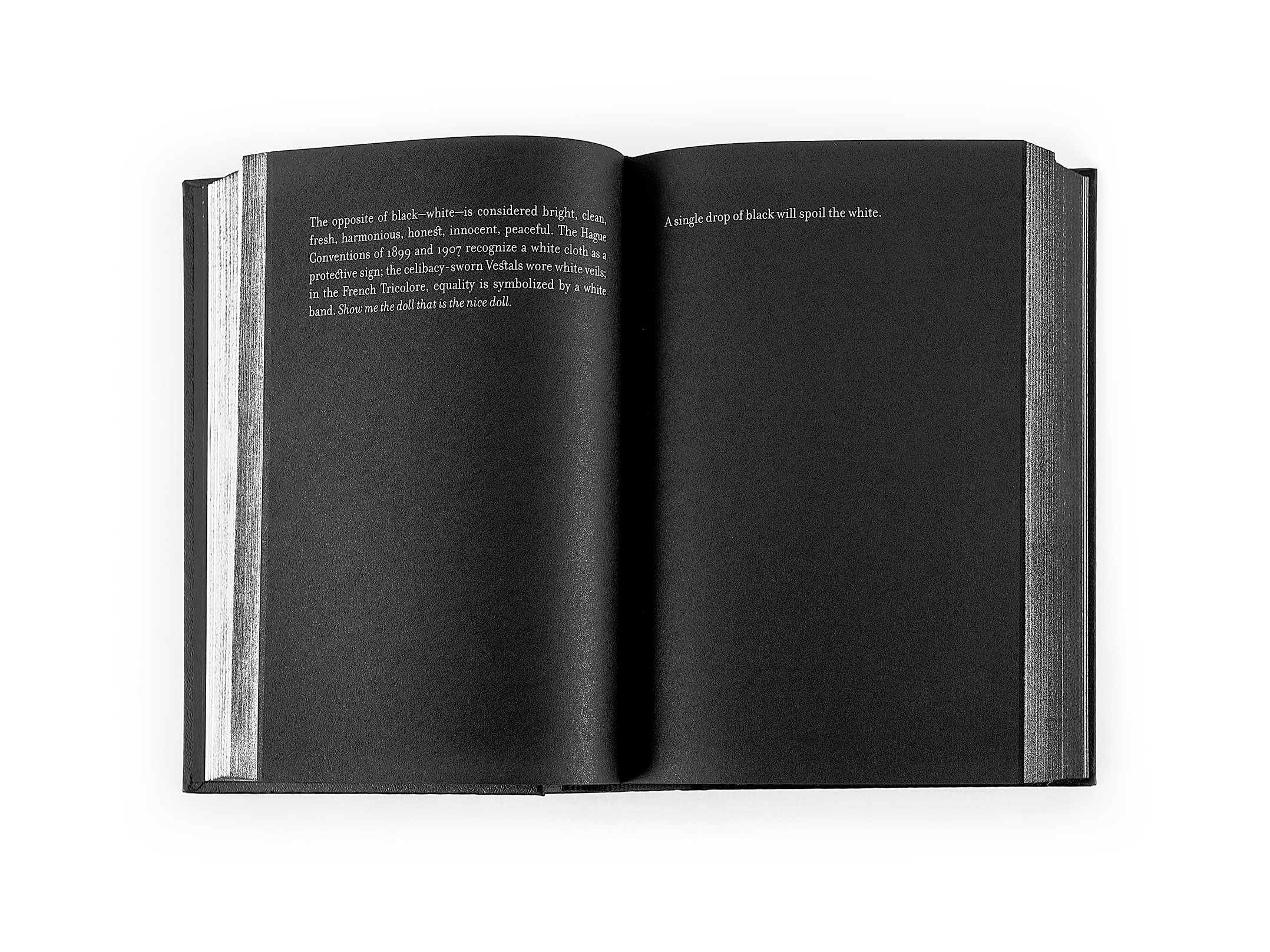 The first comprises 1,001 names for different nuances of black, taken from, for example, make-up, car paint, artist pigments, tattoo ink, and house paint. The often expressive names have been collated into an associative flow that transports the reader from countries and cities, over mountains and oceans, down among plants and animals, out into space, to myths and religions, power and eroticism, war and death.