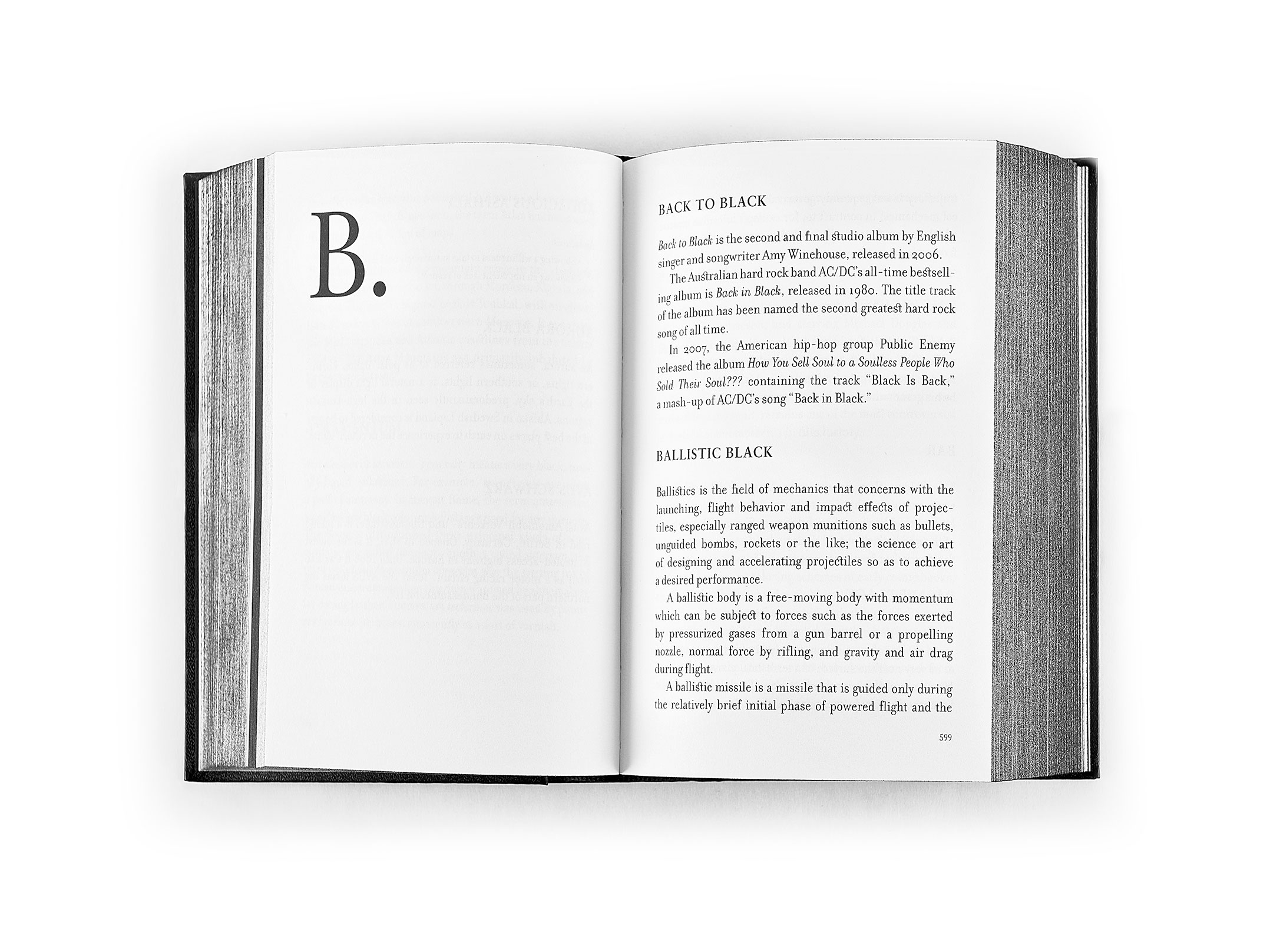 The second part is a lexicon using a selection of the names as its point of departure. The contents of the articles are based on a variety of materials, collected with a serendipitous method. The name that a manufacturer has chosen for its black shade becomes a growing network of tributaries connecting to the world. Following the different branches leads to vastly different contexts such as pop music, contemporary art, sports, poetry, film, dictionaries, political speeches, and scientific articles. One or other autobiographical detail has been scattered among the articles. The different sources, perspectives, and media give a multifaceted impression of the connotative and associative capacity of the color.