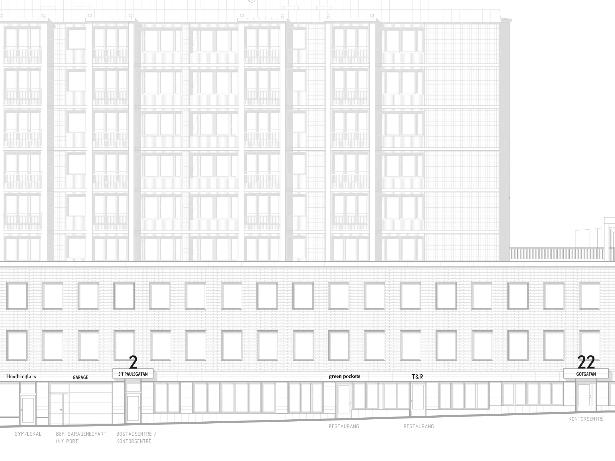 The subdivided building at the intersection of Sankt Paulsgatan and Götgatan was designed by Hack Kampmann and built between 1959 and 1962. The design of the Schönborg Quarter where it is situated is remarkably typical of its time, and Stockholm City Museum has classified it as being of particular cultural value. Diagonally across the road is one of Slussen’s subway entrances. Slussen is one of Stockholm’s most central hubs. As the city’s needs have changed, Slussen has been designed and re-designed, built and rebuilt, inaugurated and re-inaugurated. At the time when the Schönborg Quarter was constructed, Slussen was undergoing its greatest development phase to date.