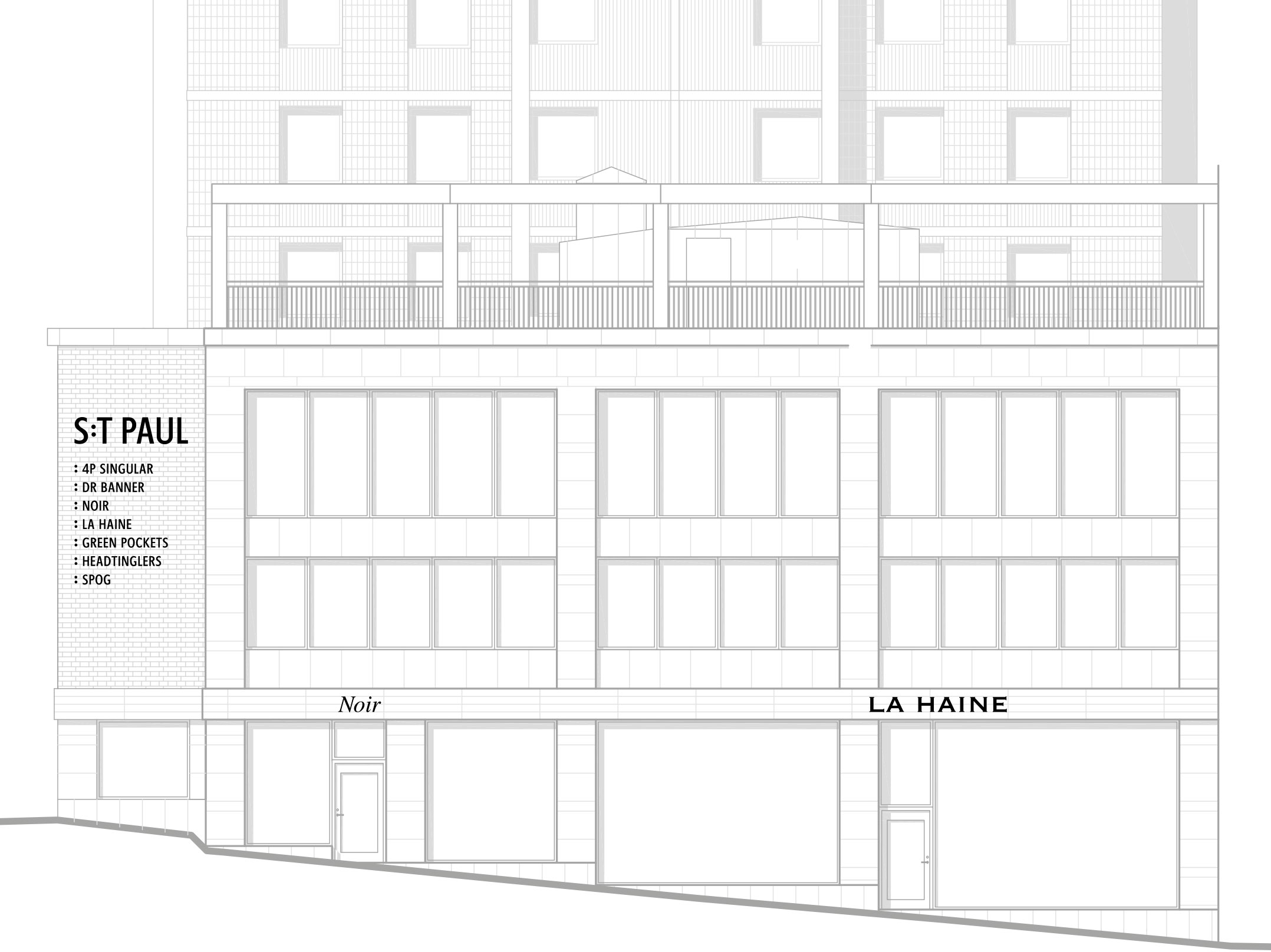 S:t Paul’s significant logotype and a list of all the parties is placed in the characteristic corner. Every company name that is presented in the corner is preceded by a colon. Just like the names of the residents are presented uniformly on the information signs in the lobbies, the company names are presented uniformly in the corner. This marks S:t Paul as a unit.